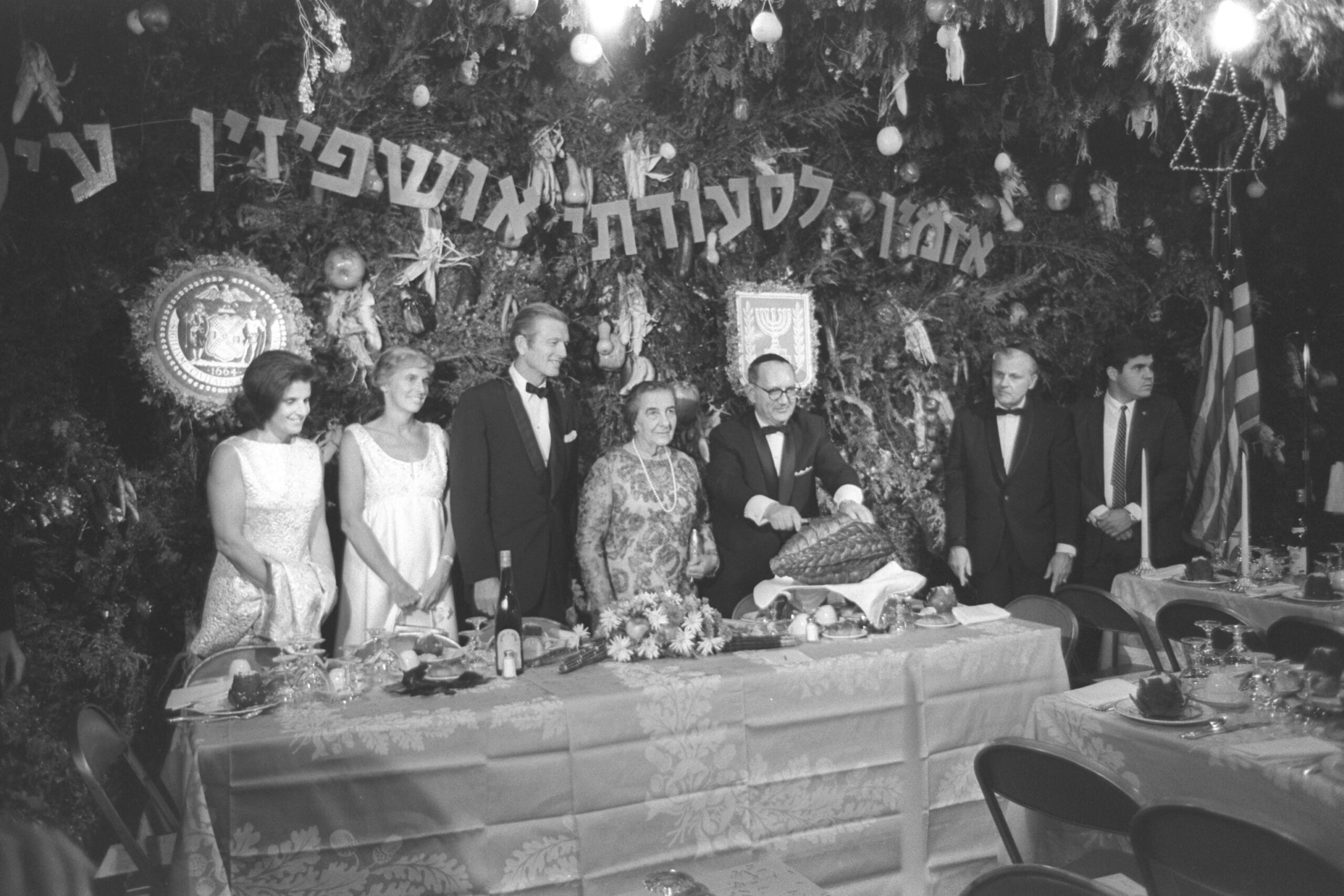 P.M. GOLDA MEIR WITH MAYOR LINDSAY AN HIS WIFE ANDMRS. RABIN (L) ATTENDING THE TRADITIONAL CUTTING OF THE HALLA BY RABBI EMANUEL BACKMAN IN A SUCCA AT BROOKLYN IN N.Y